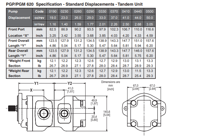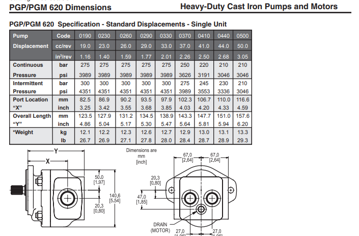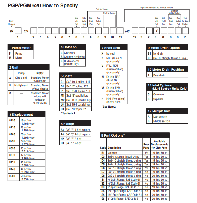 單個Parker PGP620系列泵有12種排量,從16cc / rev到52cc / rev:PGP620A-0160 | PGP620A-0190 | PGP620A-0230 | PGP620A-0260 | PGP620A-0290 | PGP620A-0330 | PGP620A-0360 | PGP620A-0370 | PGP620A-0410 | PGP620A-0440 | PGP620A-0500 | PGP620A-0520