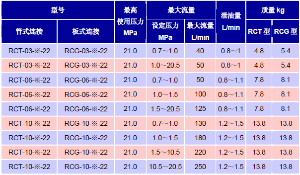 公布油研單向減壓閥RCT系列技術參數,如圖所示: