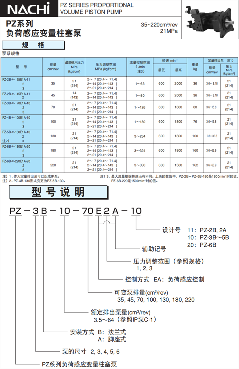 不二越PZ系列負荷感應變量柱塞泵規格及型號說明: