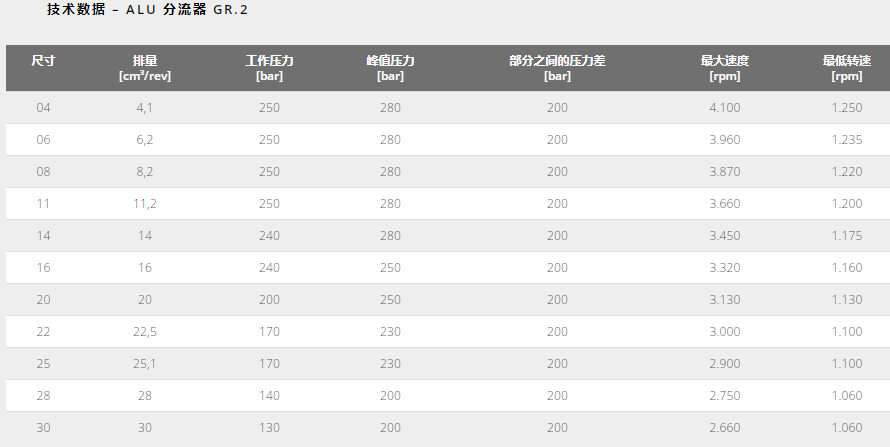 | 尺寸 | 排量 [cm?/rev] | 工作壓力 [bar] | 峰值壓力 [bar] | 部分之間的壓力差 [bar] | 最大速度 [rpm] | 最低轉速 [rpm] |