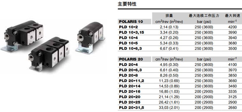 排量范圍:從2,14 cm3/rev (0.13 in3/rev) 到33,03 cm3/rev (2.01 in3/rev);分10, 20兩個規(guī)格。