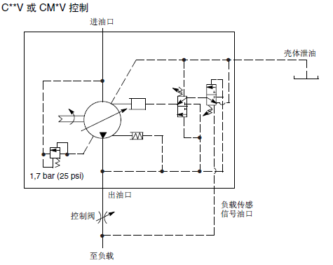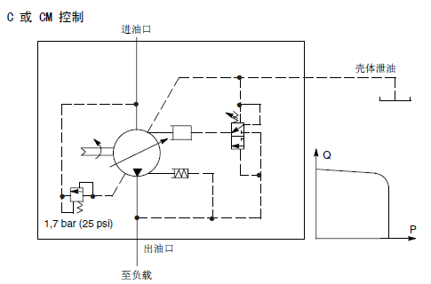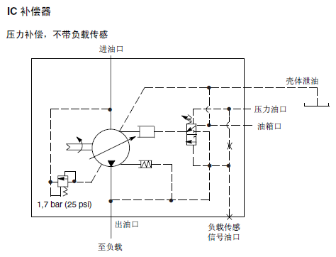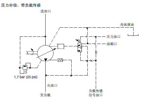 彈簧腔(控制)壓力與出口壓力之間隔著一個內部節流孔。當節流孔壓降達到壓差設定值時出口壓力使閥芯移動,泵排量減小。
