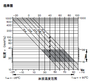 2、選擇液壓油時,在工作溫度范圍內,其粘度應處于最佳范圍(ν最佳 )內;請參見選擇圖中的陰影部分。建議在所有情況下都選擇較高的粘度等級。