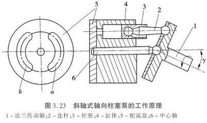 在變量形式上,斜盤(pán)式軸向柱塞泵靠斜盤(pán)擺動(dòng)變量,斜軸式軸向柱塞泵則為擺缸變量,因此,后者的變量系統(tǒng)的響應(yīng)較慢。關(guān)于斜軸泵的排量和流量可參照斜盤(pán)式泵的計(jì)算方法計(jì)算。